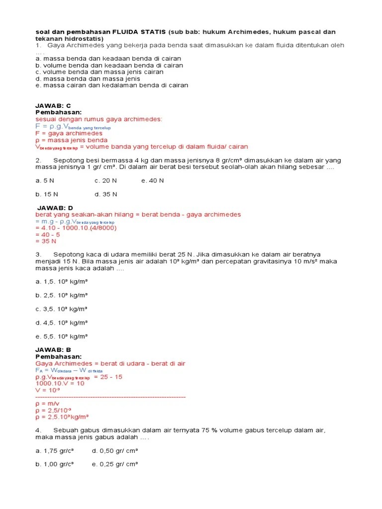Contoh soal fluida fluida dinamis fluida statis fluida statis kelas xi jawabannya pembahasan fluida pembahasan soal unbk pilihan ganda soal . Pembahasan soal fluida dinamis no. Contoh soal fluida statis dan pembahasan lengkap. Rangkuman materi bab fluida statis kelas xi 11 disertai contoh soal dan jawaban dengan pembahasan lengkapnya . Hukum archimedes hukum pascal dan tekanan hidrostatis 1.
